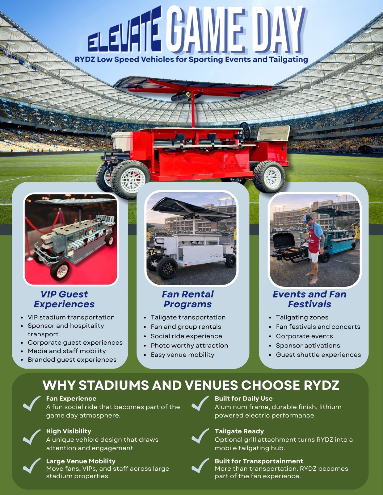 From large stadiums to community sports complexes, the RYDZ Low Speed Vehicle (LSV) adds mobility, visibility, and fun to sporting events of all sizes. Designed to move people comfortably while creating memorable fan experiences, RYDZ is ideal for team transport, event logistics, and tailgate activations.