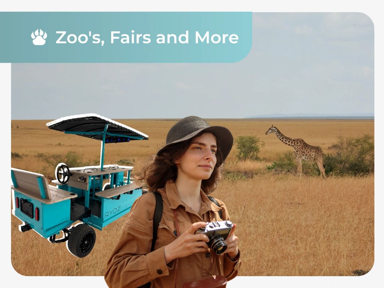 RYDZ Low Speed Vehicles (LSV) are the perfect solution for large, walkable attractions like zoos, county fairs, expos, and seasonal festivals. Designed to enhance mobility, comfort, and visibility, RYDZ makes it easy to move guests, staff, or equipment across expansive grounds with style and ease.